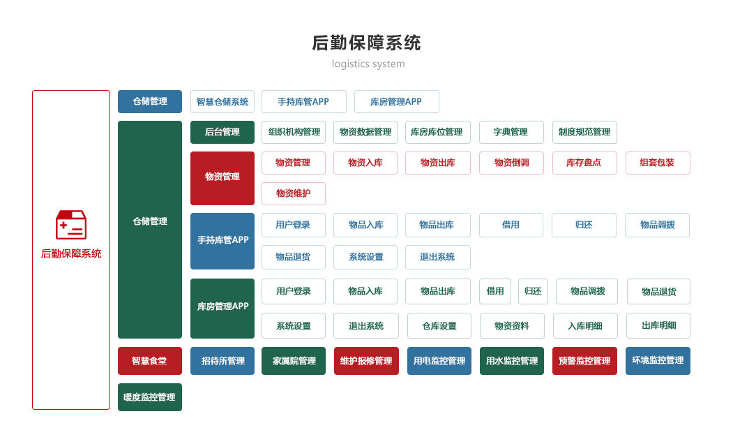 綜合保障系統(tǒng)依托物聯(lián)網(wǎng)、RFID識別和傳感技術(shù),著眼作戰(zhàn)精準保障、戰(zhàn)備常態(tài)保障和官兵生活保障,對戰(zhàn)備物資、裝備器材、營房物資和被裝物資等的全生命周期的電子化管理,對官兵的健康實時監(jiān)護。包含財務(wù)管理、軍需油運、武器裝備、衛(wèi)勤管理、營房管理模塊。確保部隊出動,車輛給養(yǎng)油料跟得上,裝備維護情況實時掌握,營房管理工作平時與戰(zhàn)備同步推進。